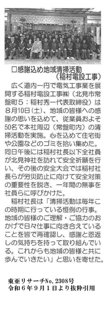 2024.08.19 8月10日(土)地域貢献活動の一環として、本社周辺町内の清掃活動を行いました。 午後からは北見神社で安全祈願、会社にて安全大会を実施、 夕方からは日頃お世話になっている方たちをお迎えし、懇親会を執り行いました。